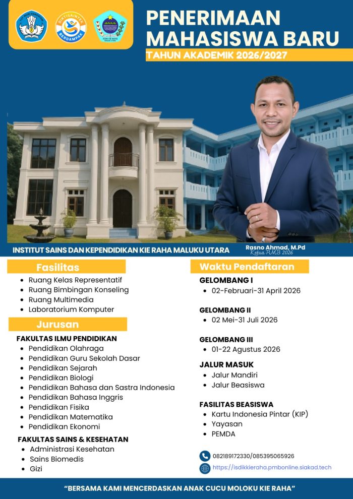 Senjakota- Institut Sains dan Kependidikan (ISDIK) Kie Raha Maluku Utara resmi membuka pendaftaran Penerimaan Mahasiswa Baru (PMB) Tahun Akademik 2026/2027. Pembukaan PMB ini menjadi bagian dari komitmen kampus dalam menyiapkan sumber daya manusia unggul di bidang pendidikan dan kesehatan di Maluku Utara.